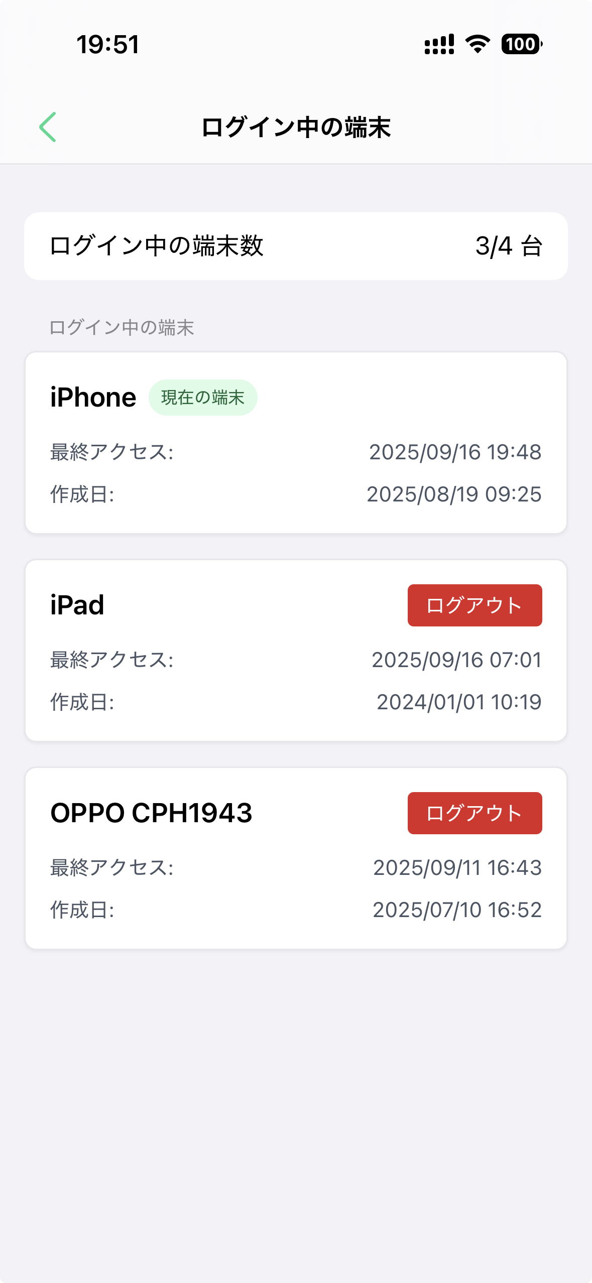 「ログイン中の端末」管理画面