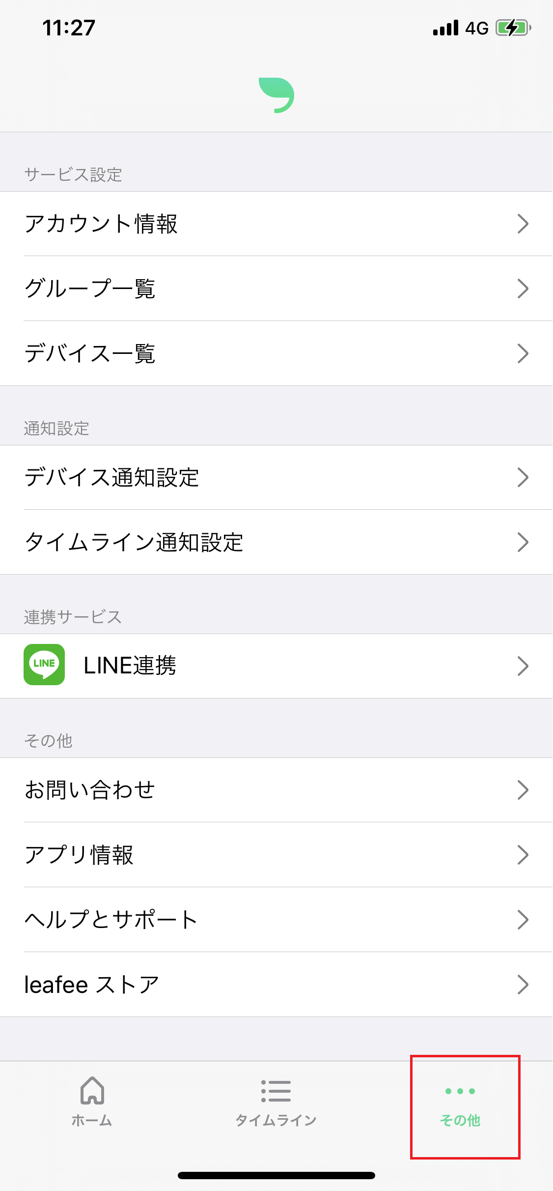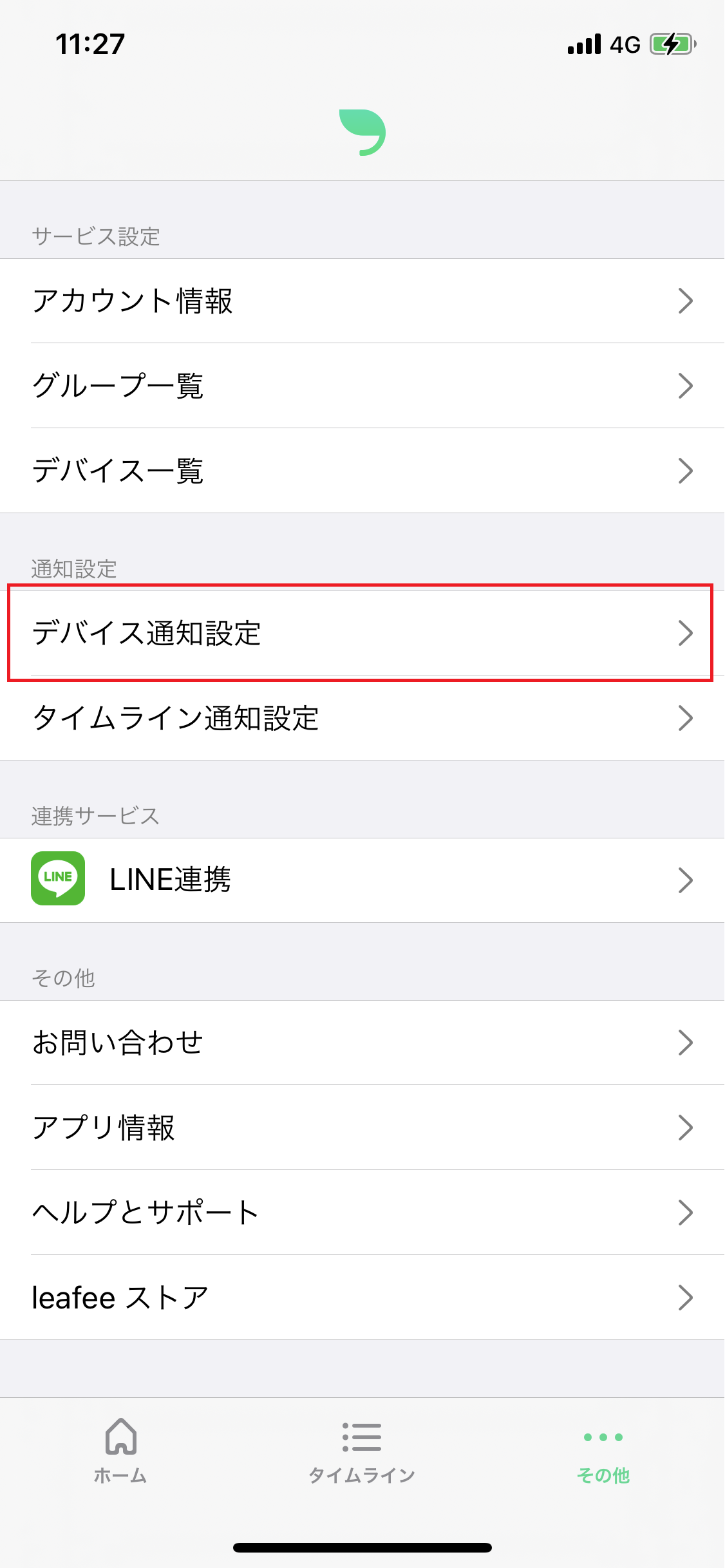 スマートフォン上でleafeeアプリへの通知が許可されていない設定になっているお手元のスマートフォン 待ち受け画面から「設定」を選び、通知設定画面でleafeeアプリの通知を許可してください