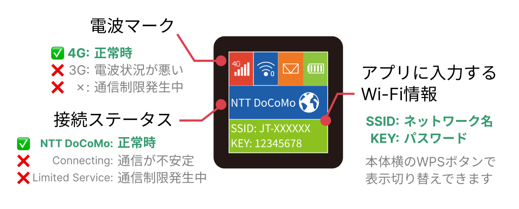 Wi-Fiの接続情報を確認したい場合は、本体横のWPSボタンを数回押して液晶画面の表示内容を切り替えてください。