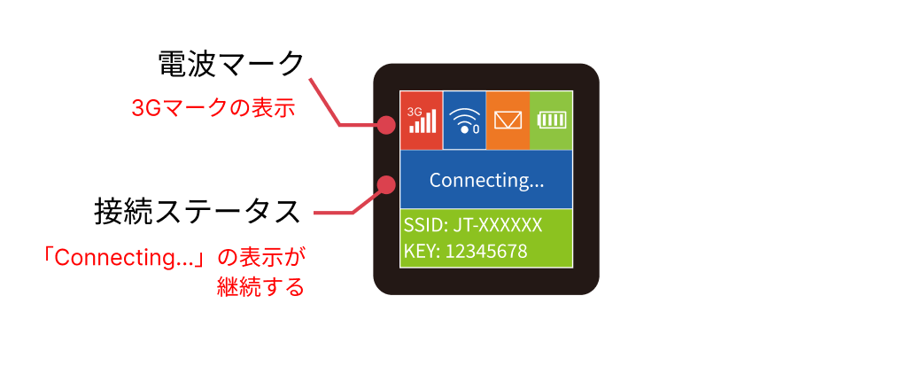 電源投入後、液晶表示で4G(LTE)回線の電波状況や、充電状況・カメラに設定するWi-Fiの接続情報を確認できます。