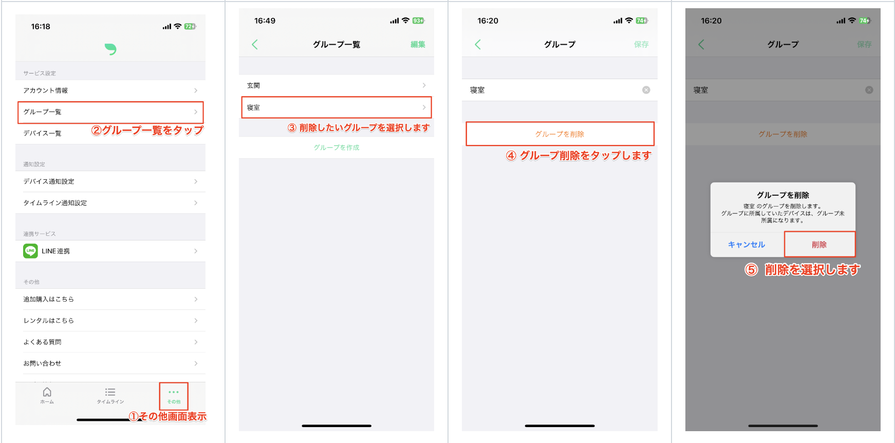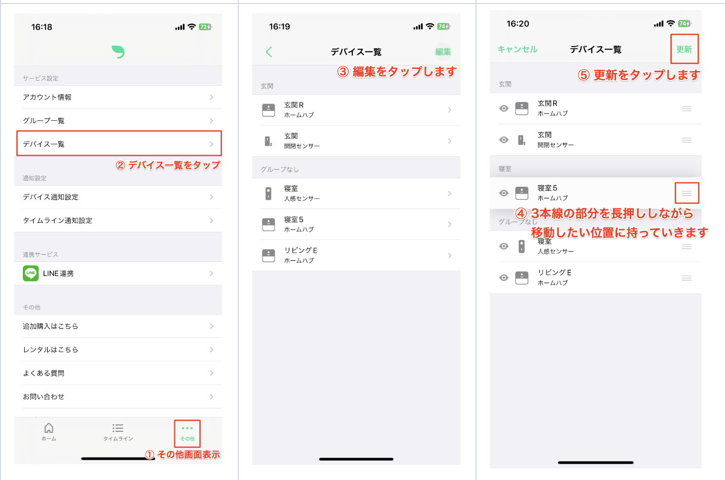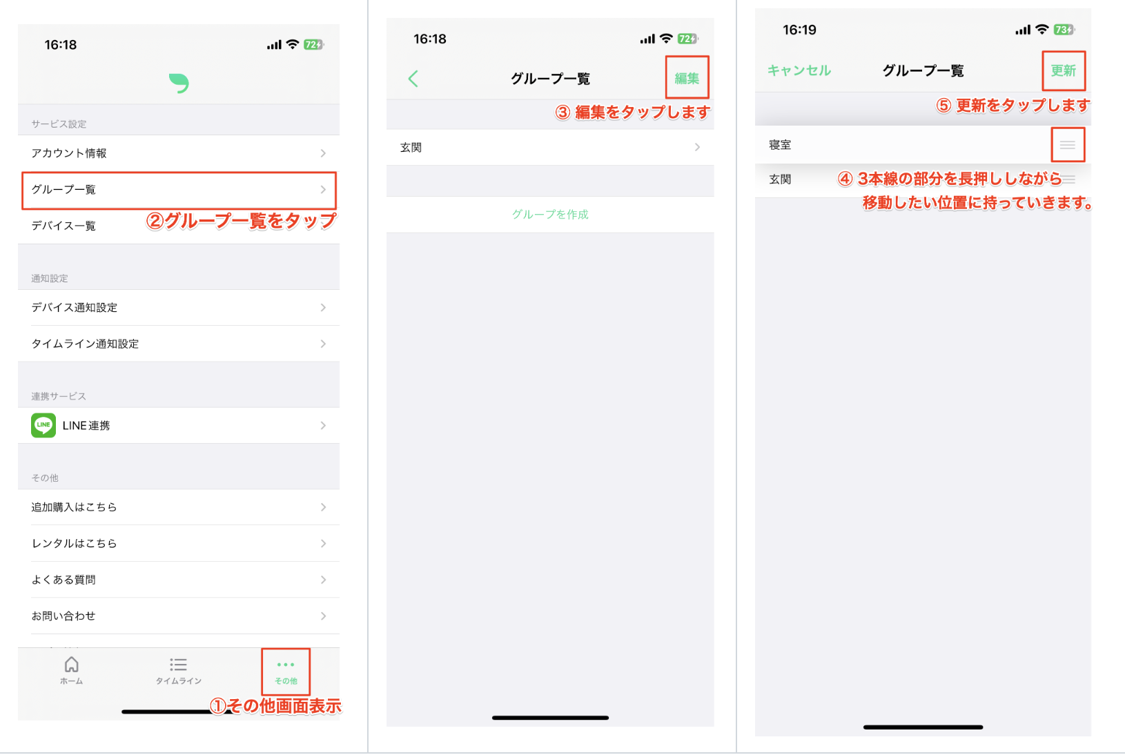 この記事では、グループ作成、デバイス並べ替え、グループ並べ替え、グループ削除、のそれぞれの方法をご確認いただけます。