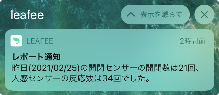 レポート通知(みまもり機能)とは、leafeeの開閉センサー(leafee mag)と人感センサー(leafee move)の反応状況を、1日2回、お手持ちのスマートフォンのアプリに通知するサービスです。