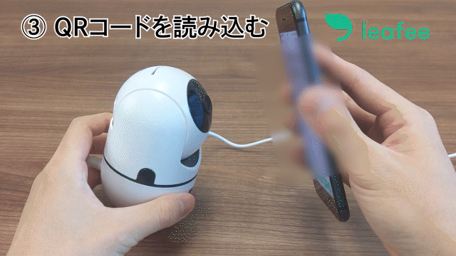 スマホに表示されたQRコードを約15~20cmの距離間で、カメラのレンズにかざしてください。 下記の画像のように、カメラとスマホを近づけた状態から徐々に離していくのがポイントです。カメラ本体が「ピッ」という音声を再生すれば読み込み成功です。