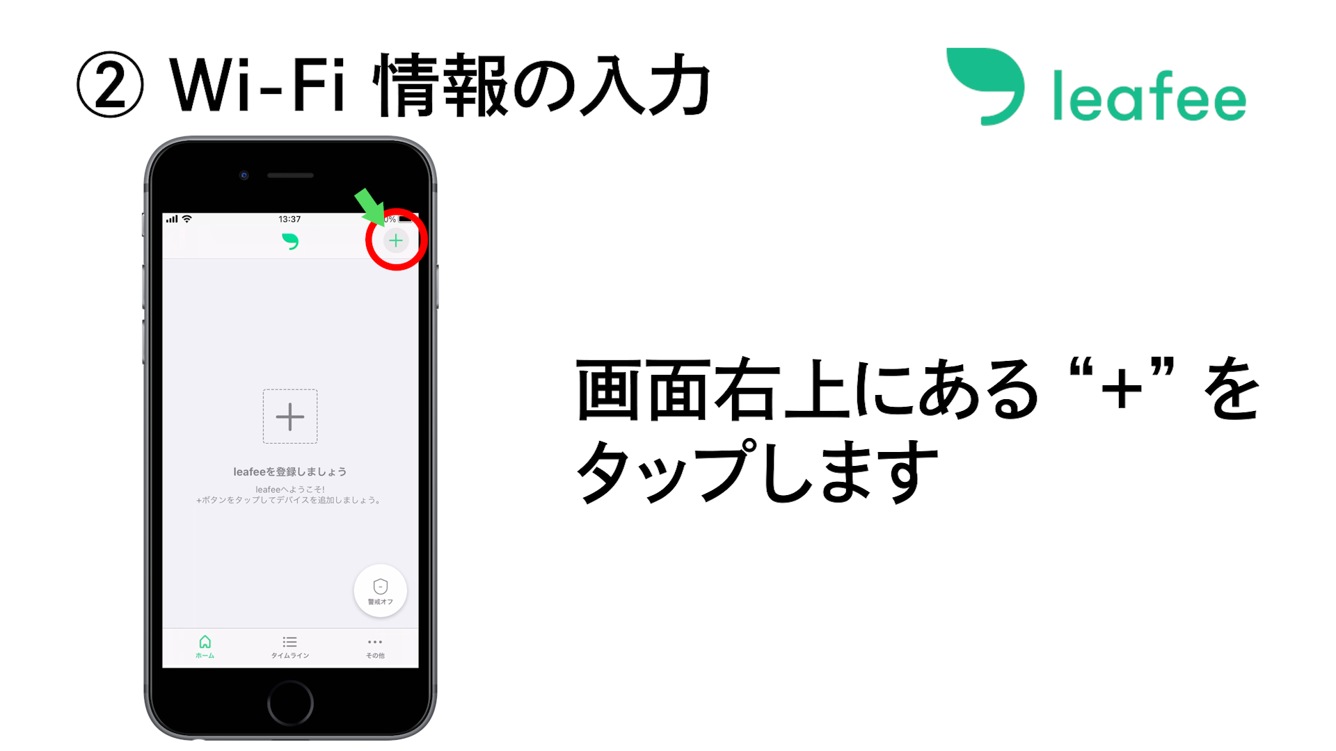 leafee アプリを立ち上げ、[ホーム] ページの右上にある [+] ボタンをタップします。
