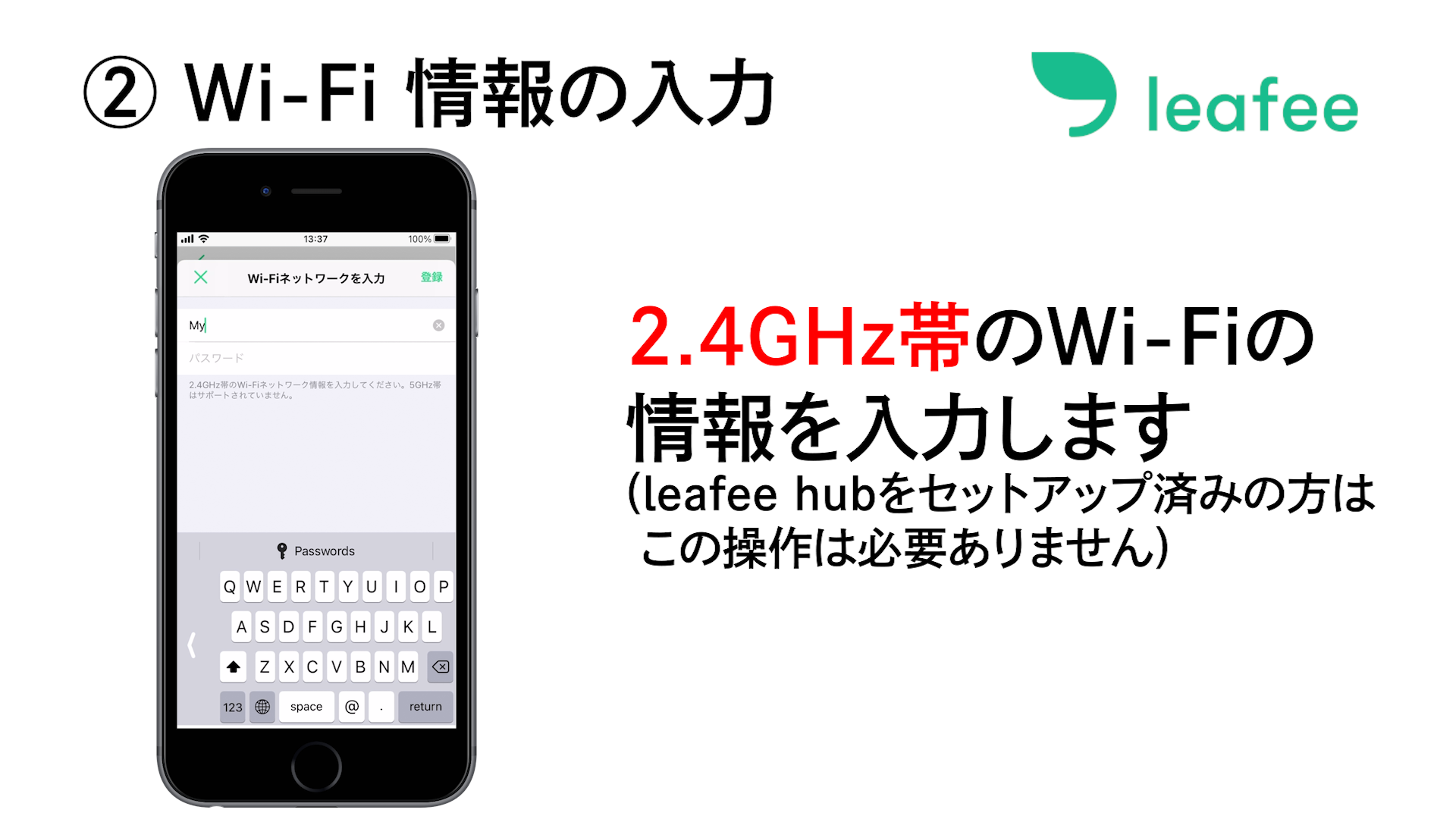 ご利用の Wi-Fi の SSID (2.4GHz 帯) とパスワードを入力します。