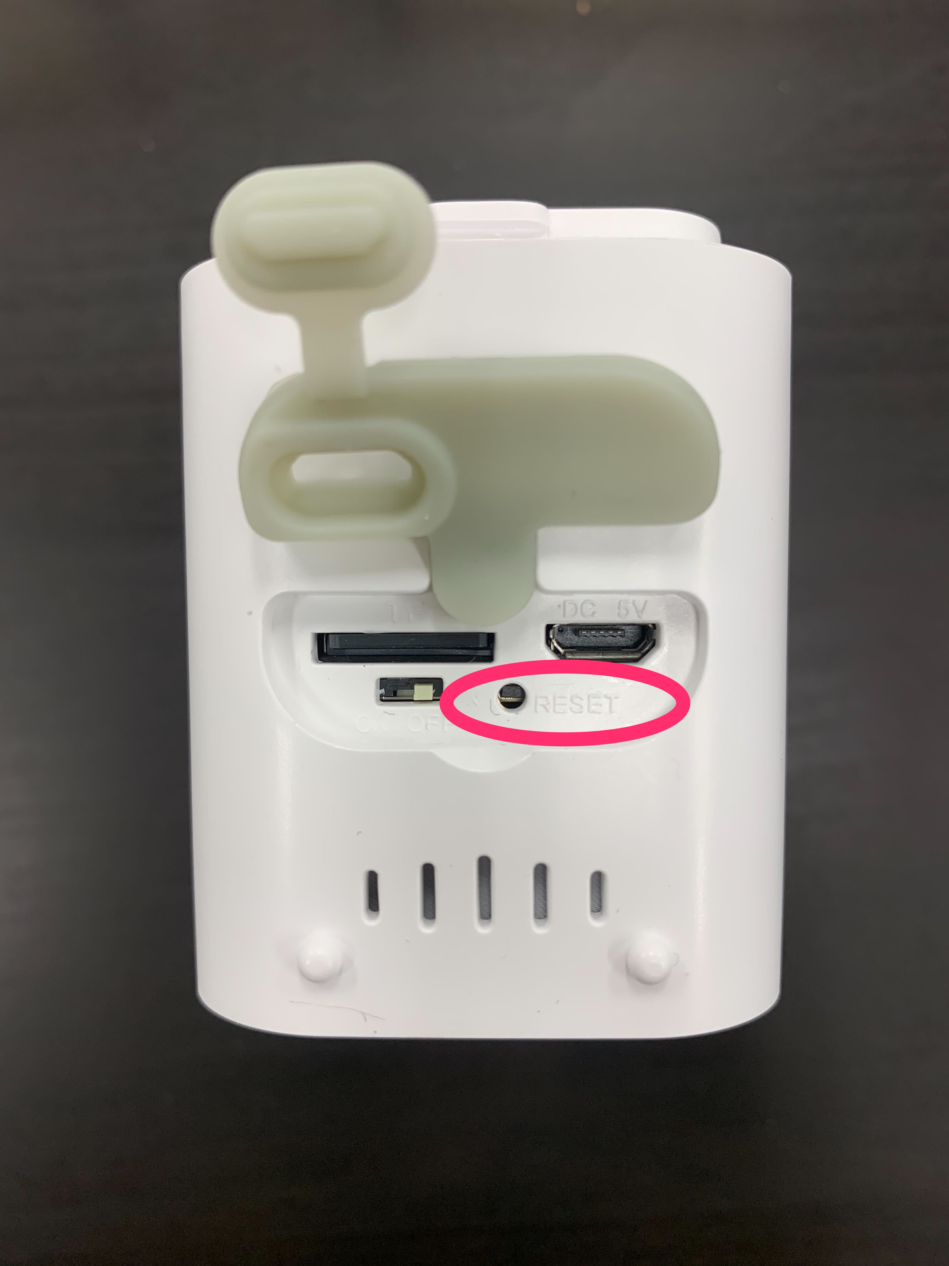 上記のように素早く点滅していない場合は、リセットピンでリセットボタンを約5秒長押し、カメラから音が鳴ったらボタンを離してください。