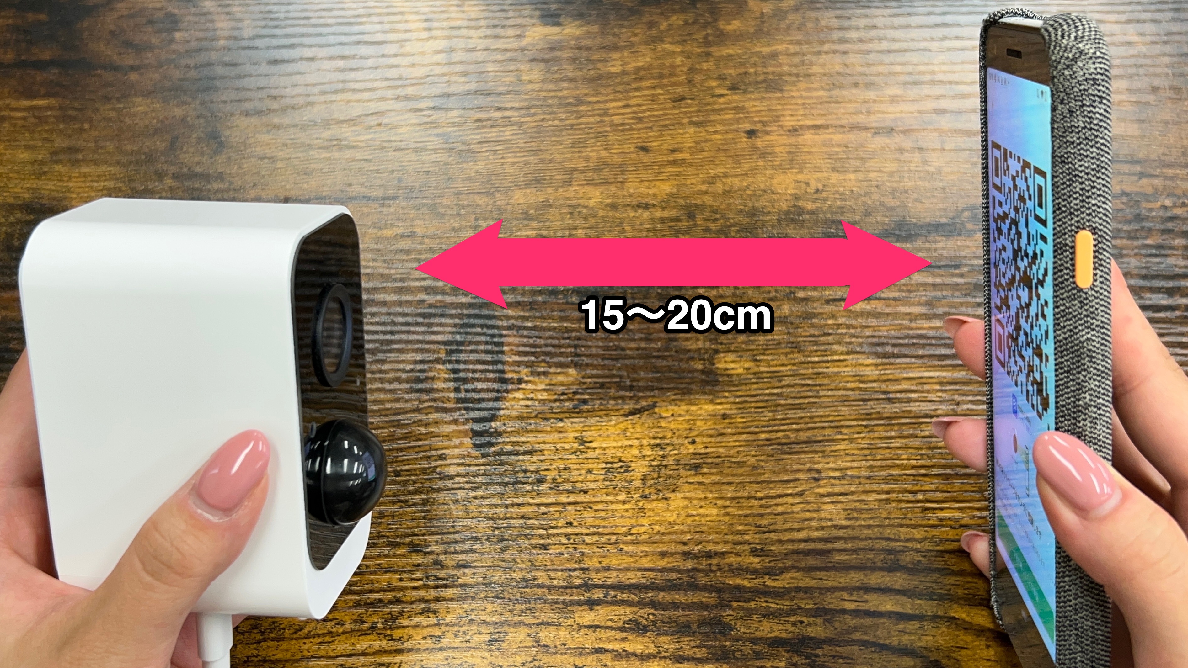 スマホに表示されたQRコードを約15~20cmの距離間で、カメラのレンズにかざしてください。