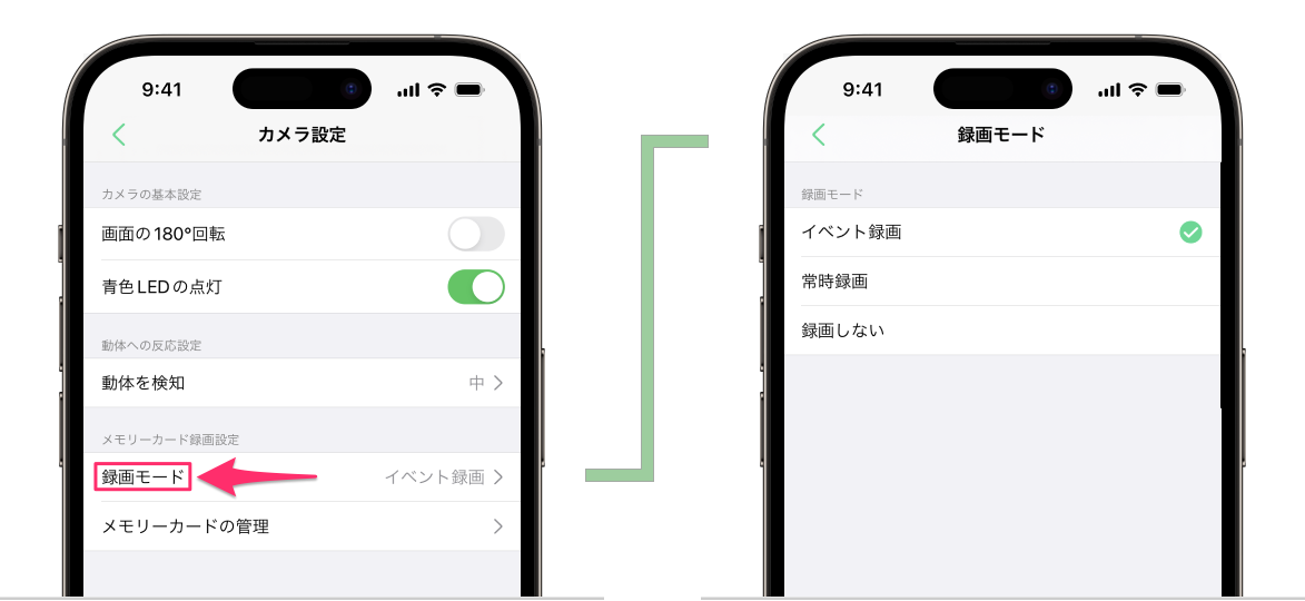 アプリのホーム画面から屋外カメラのアイコンをタッチし、カメラのデバイス設定から「カメラ設定」を開きます。メモリーカード録画設定から、録画モードの変更を行うことができます。(microSDカードを挿入していない場合はカードなしと表示されます)