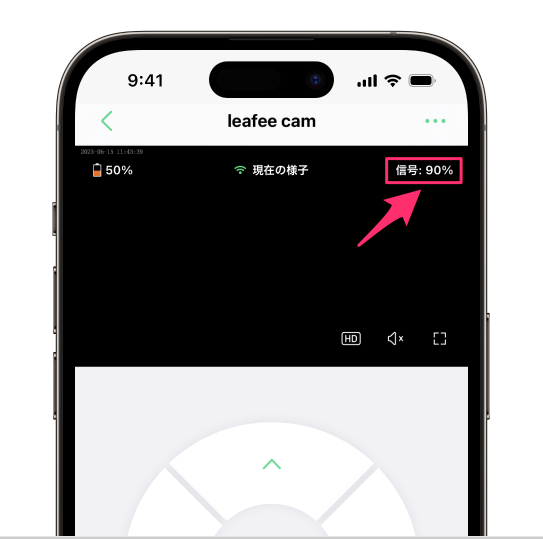 リアルタイムビデオの右上にWi-Fi 信号強度が表示されます。信号強度が70%以下になるとカメラとWi-Fiの接続が切れやすくなってしまいます。Wi-Fiルータとの接続が安定していないとバッテリの消費がはやくなります。信号強度が70%以下の場合、Wi-Fiのルーターとカメラの距離を縮めて接続を安定をさせることをお試しいただきますようお願いいたします。