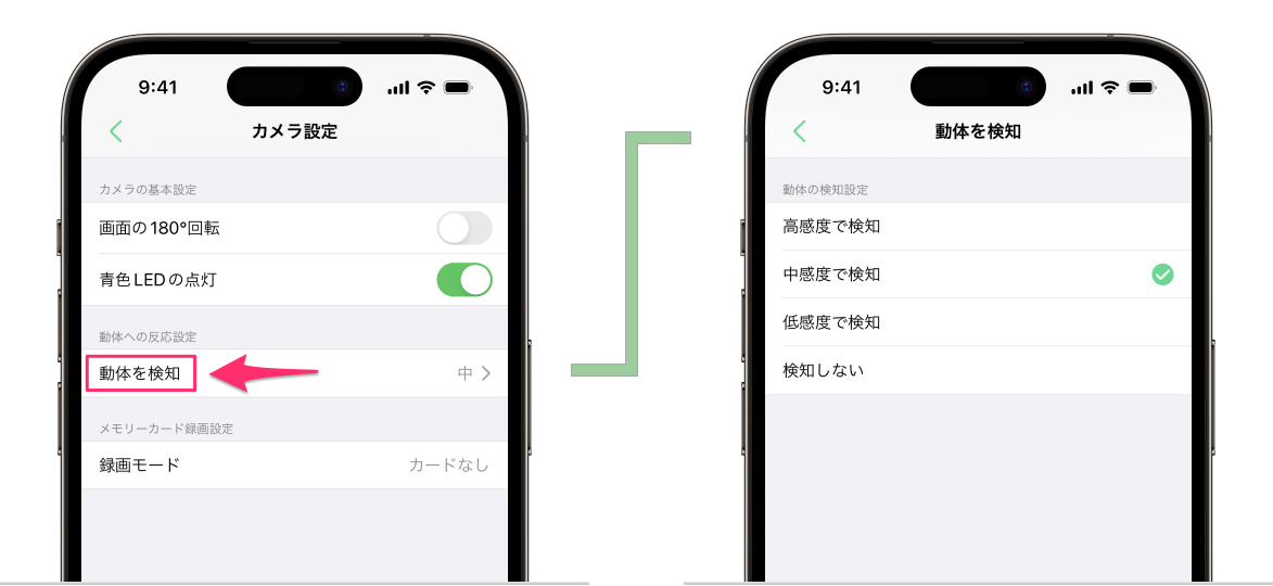 アプリのホーム画面から屋外カメラのアイコンをタッチし、カメラのデバイス設定から「カメラ設定」を開きます。動体への反応設定から、動体検知の感度の変更を行うことができます。