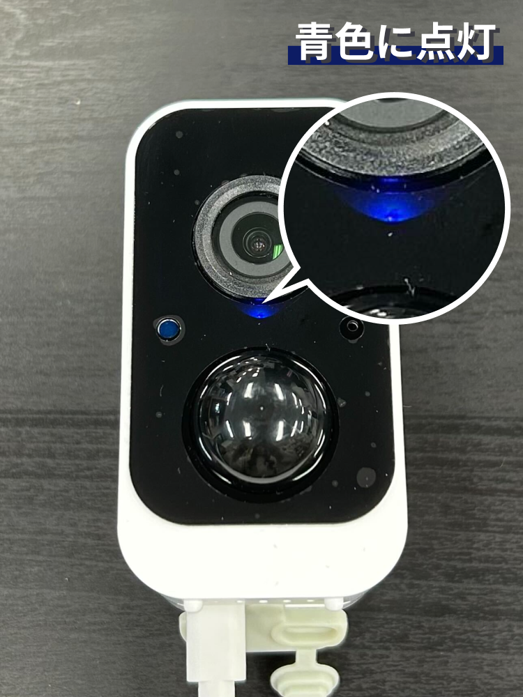 充電を開始するとカメラ下方のLEDが点灯します。カメラのバッテリの充電が満タンになると、カメラ下方のLEDが青色に点灯します。(充電中の場合は赤色に点灯)