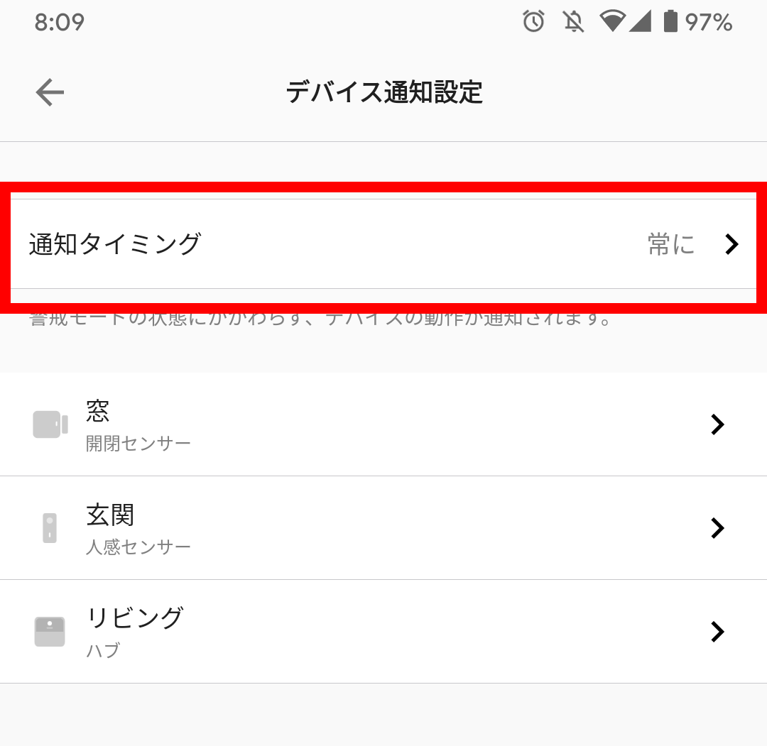 「通知タイミング機能」を使って、警戒モードに応じて、または警戒モードを使っていなくてもセンサーの反応をアプリで通知させる方法を説明いたします。