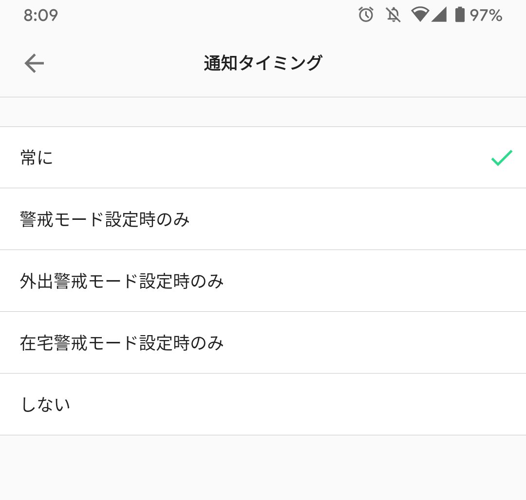 「在宅警戒モード設定時のみ」 | 在宅警戒モードになっているときだけ、センサーの反応が通知されます |