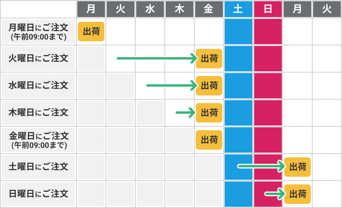 月曜日または金曜日の午前9時までのご注文は当日中に出荷いたします。