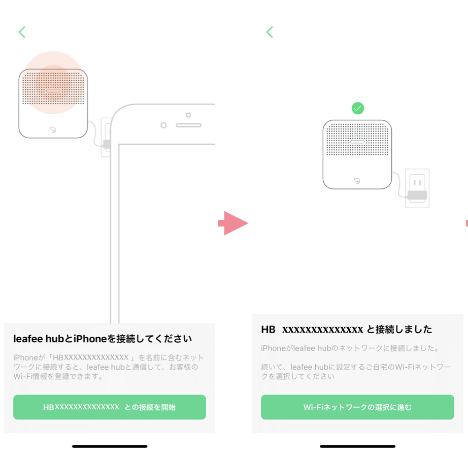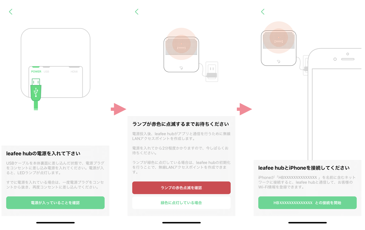 画面の指示に従って電源を入れ、「電源が入っていることを確認」をタップしてください。 電源を入れたleafee hubのランプが赤色に点滅しているのを確認したら、「ランプの赤色点滅を確認」をタップしてください。