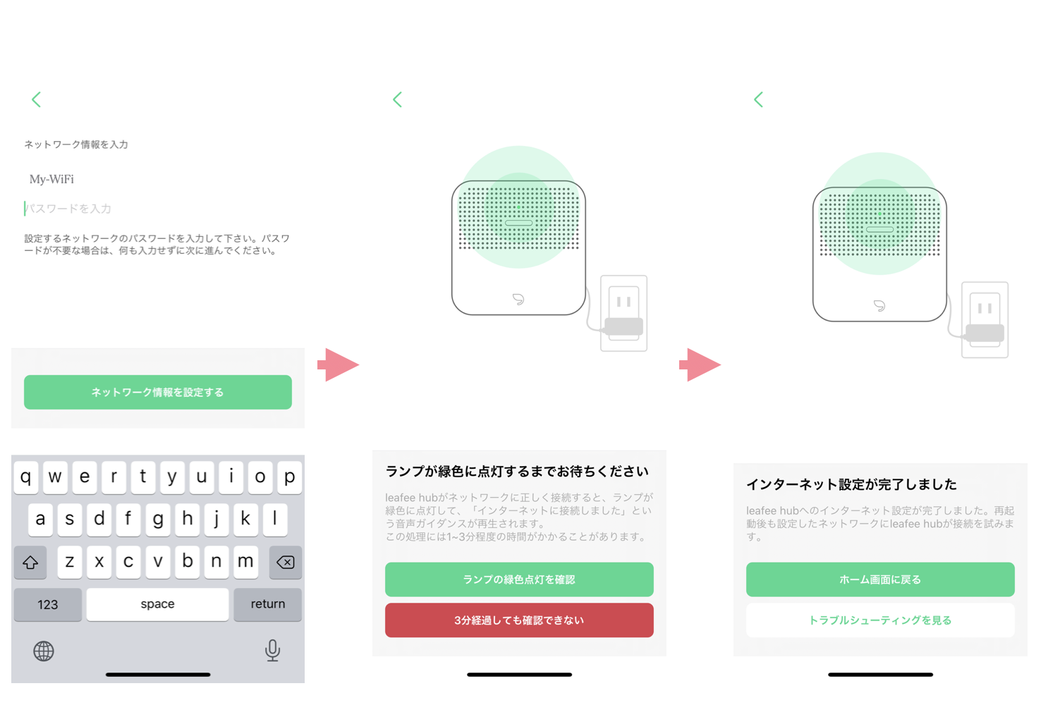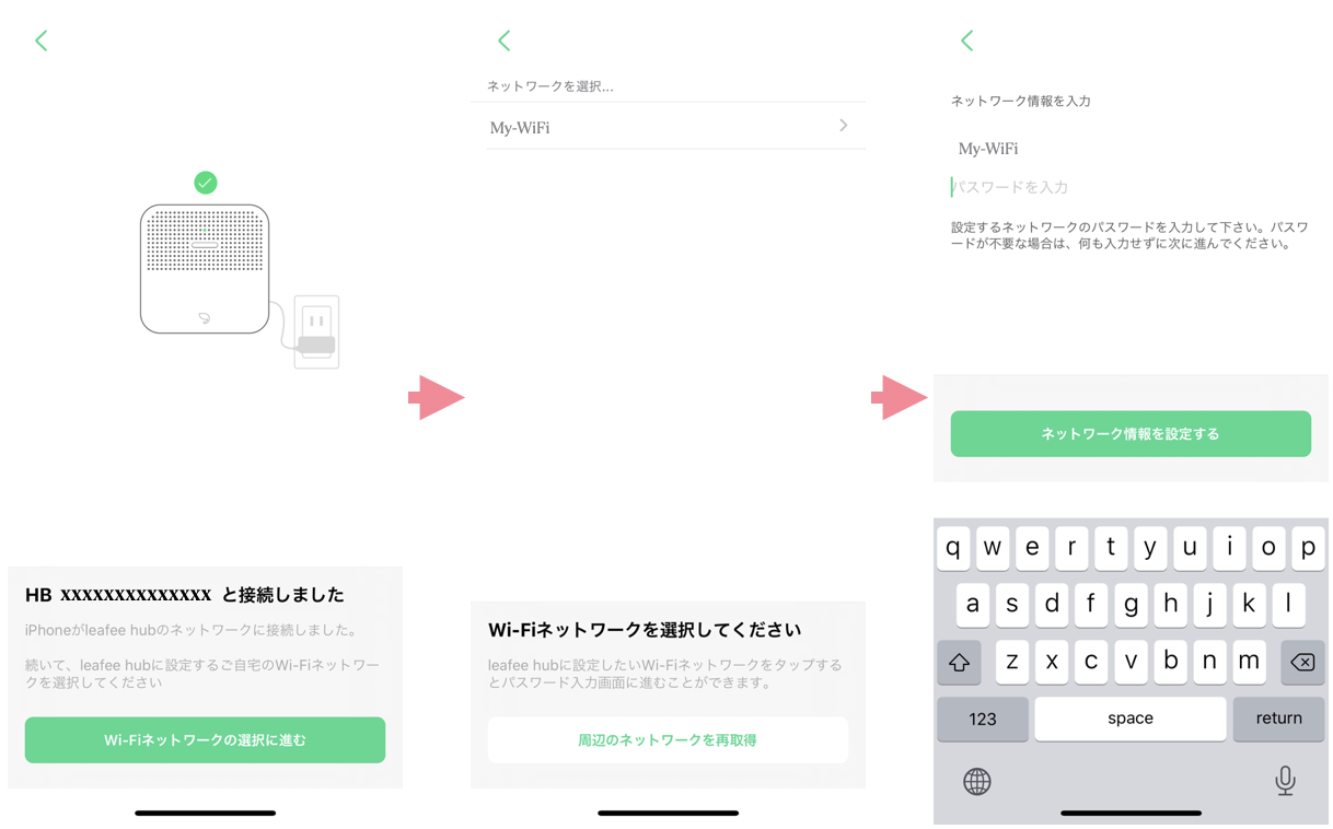 leafee専用WiFiルーターの画面の、「KEY」に表示されているパスワードを入力し、「ネットワーク情報を設定する」をタップしてください。 正しいSSIDとパスワードが入力できていれば、1~3分程度でネットワーク設定が完了し、leafee hubのランプが緑色に点灯します。