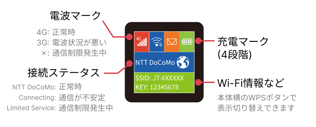 電源投入後、液晶表示で4G(LTE)回線の電波状況や、充電状況・ホームハブに設定するWi-Fiの接続情報を確認できます。