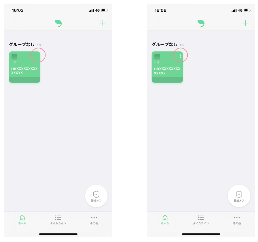 leafeeアプリのホーム画面で、登録したハブの右上に「!」が表示されていないことを確認してください。表示されている場合、hubがネットワークに接続できておらず再設定が必要です。