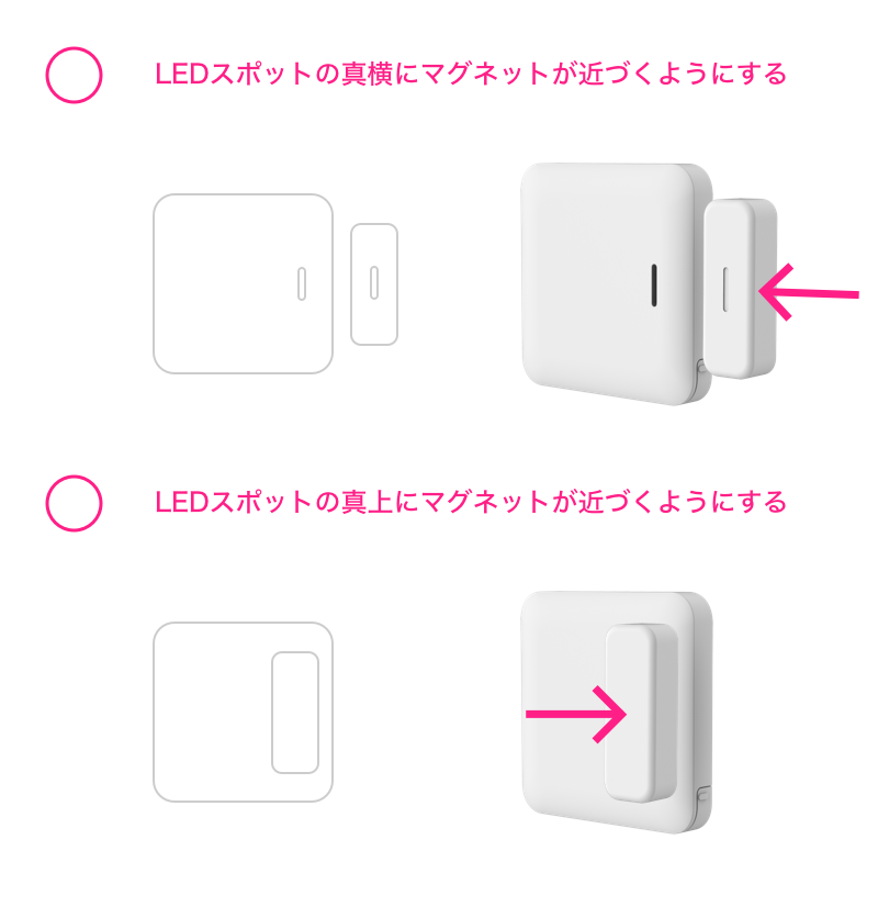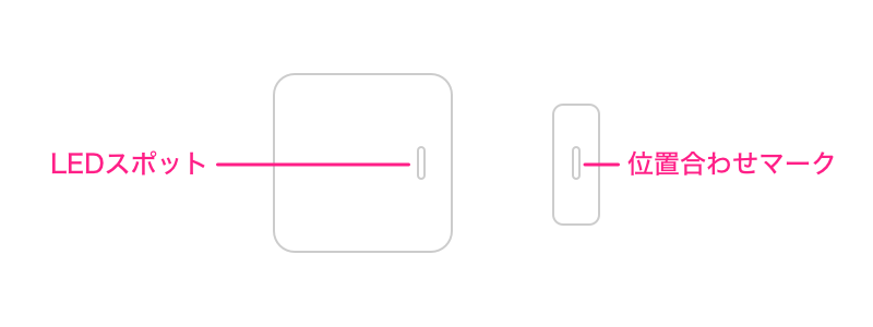 センサー本体とマグネットの位置を確実にあわせるためには、センサー本体のLEDスポットとマグネットの位置合わせマークを活用します。
