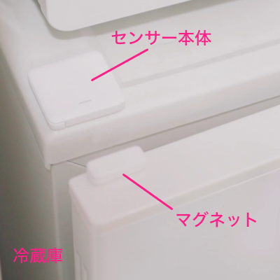 冷蔵庫本体にセンサー本体、扉にマグネットを取り付けます。