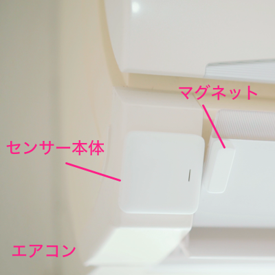 エアコンをオフにした状態で、エアコン本体にセンサー本体、 風向板にマグネットを取り付けます。