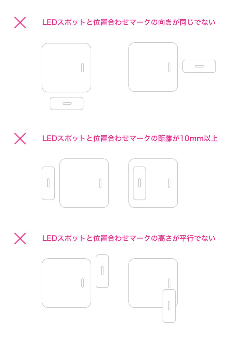 センサー本体のLEDスポットと、マグネットの位置合わせマークを確認したら、下記のポイントに注意して位置合わせを行ってください。